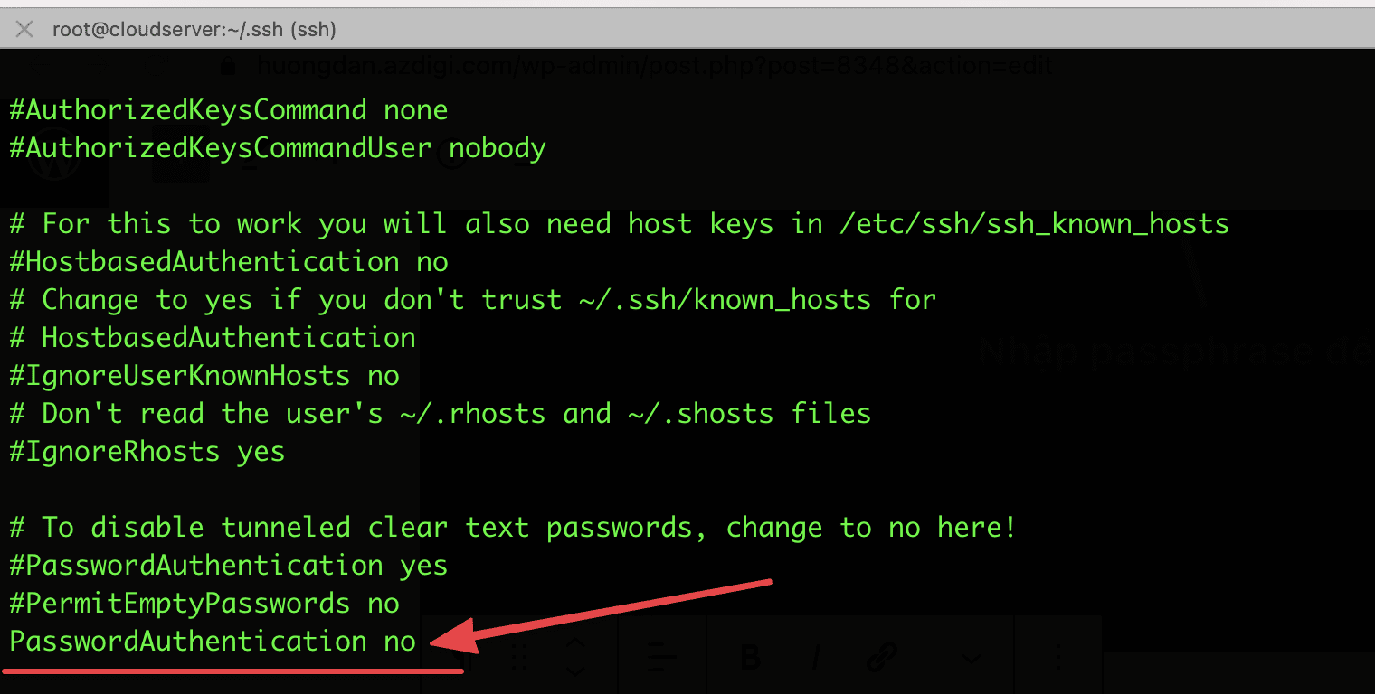 Sau khi đã SSH key thành công bạn có thể tắt cho phép SSH bằng Passwd đi để tránh do passwd và brute force attack nhé. Để tắt đăng nhập ssh bằng passwd bạn thực hiện như sau. Bạn mở file /etc/ssh/sshd_config sau đó tìm đến dòng PasswordAuthentication Yes bạn chuyển thành PasswordAuthentication no