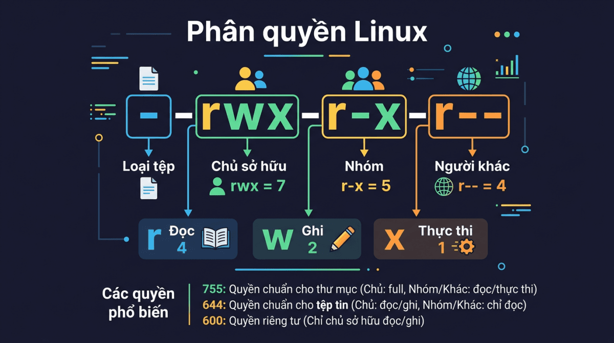 Phân quyền file và thư mục là cách Linux giải quyết vấn đề này. Mỗi file, mỗi thư mục đều có thông tin rõ ràng: ai sở hữu, ai được đọc, ai được ghi, ai được thực thi. Hiểu được cách phân quyền hoạt động thì bạn sẽ biết tại sao web bị lỗi 403, tại sao script không chạy được, tại sao SSH Key bị từ chối.