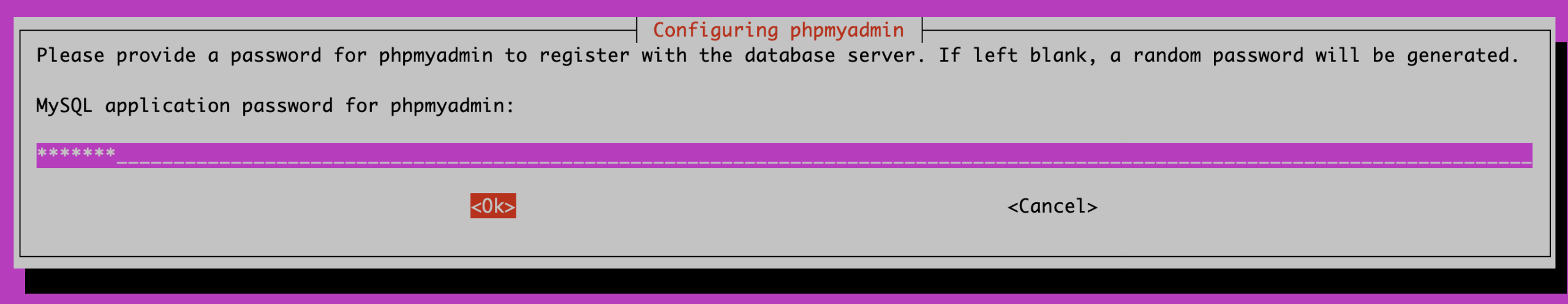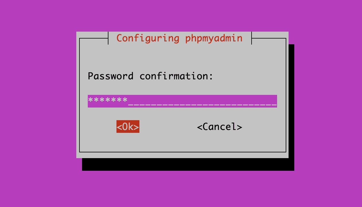 Bây giờ bạn tạo mật khẩu mới cho user phpmyadmin và nhấn nút Tab để chuyển sang OK và nhấn Enter.