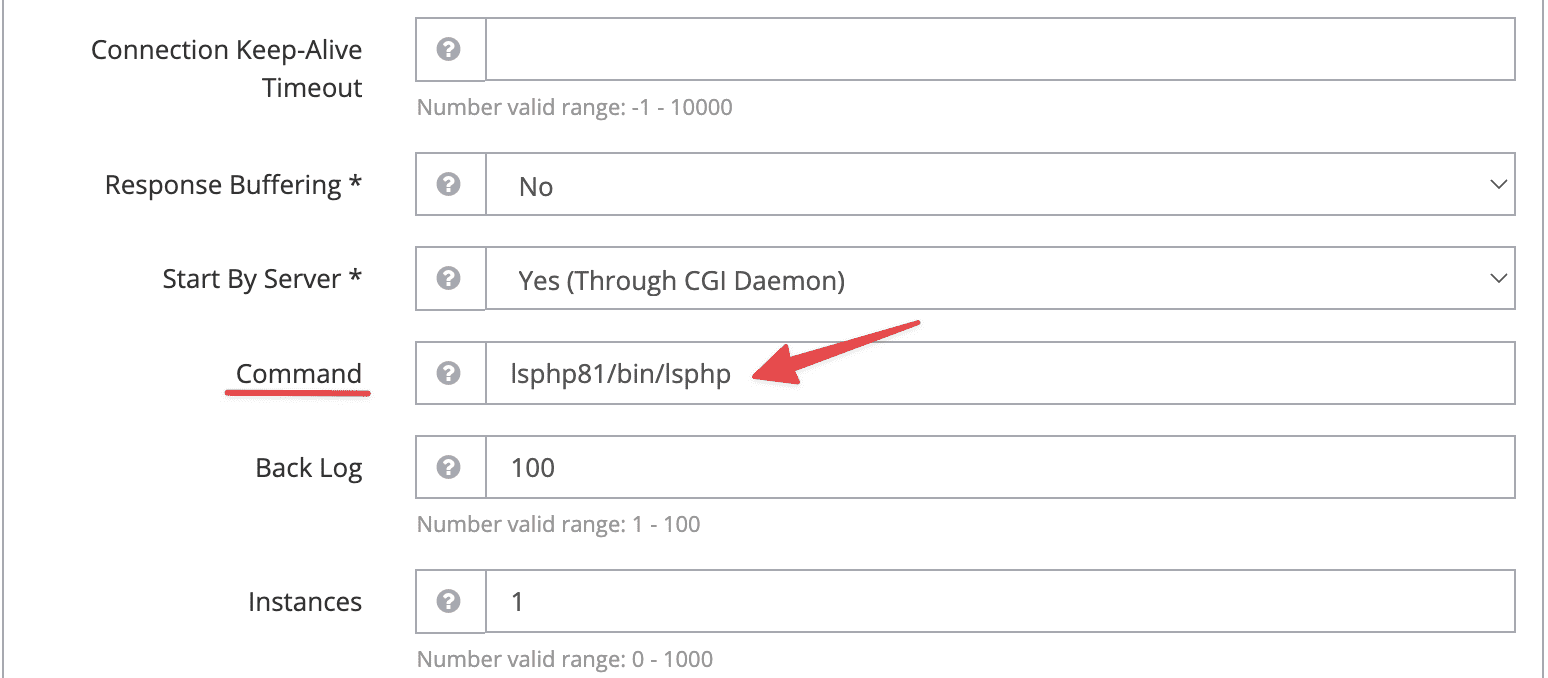 Tiếp đó bạn kéo xuống phần Command, và điền nội dung lsphp81/bin/lsphp vào. Nếu trước đó bạn cài đặt phiên bản PHP khác, thì bạn chỉ cần thay 81 bằng bản PHP của bạn.