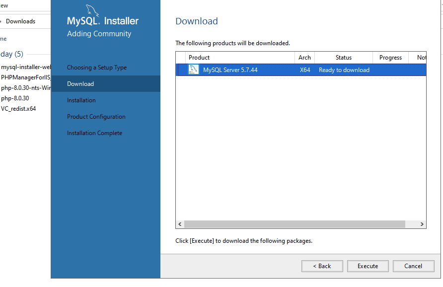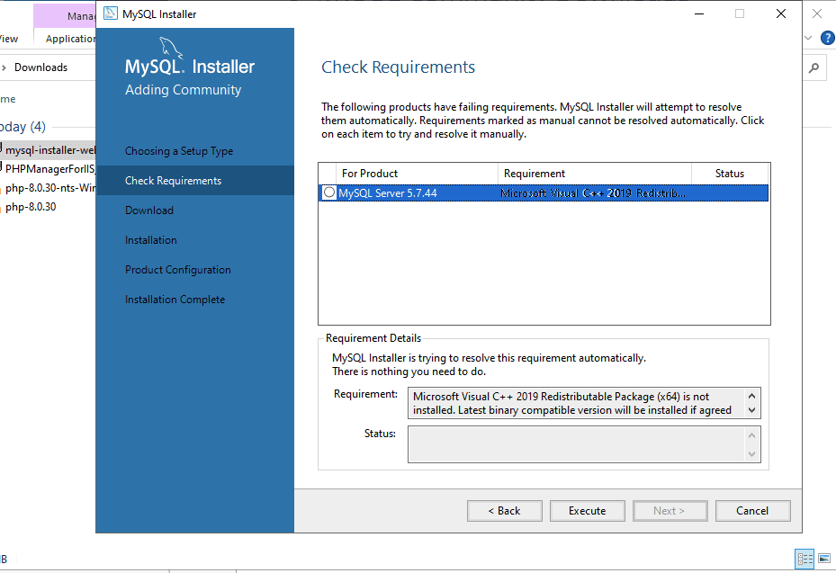 Sau khi đã cài đặt được Visual C++ 2019 chọn Execute để cài đặt MySQL