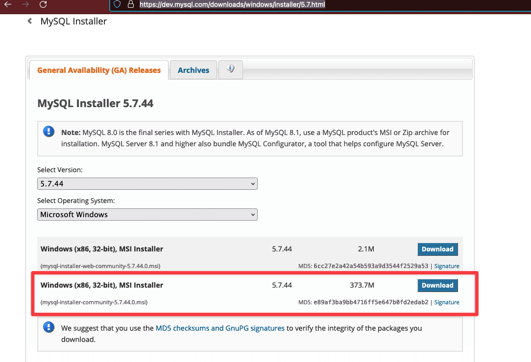 - Link download: https://dev.mysql.com/downloads/windows/installer/5.7.html