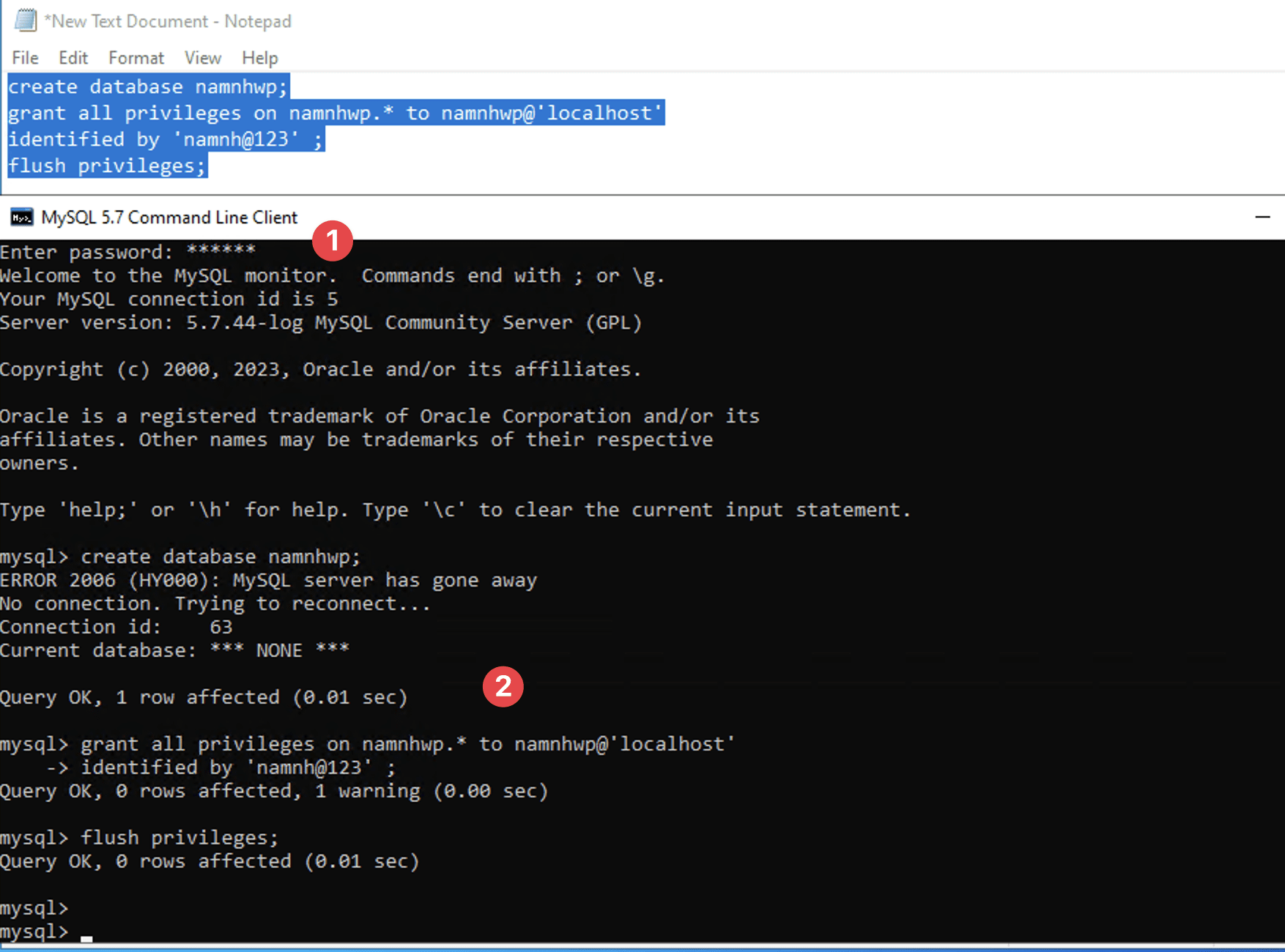 Bạn mở MySQL 5.7 Command Line Client và chạy các lệnh sau. Và hãy thay namnhwp bằng tên DB của bạn, namnh@123 bằng mật khẩu của bạn.