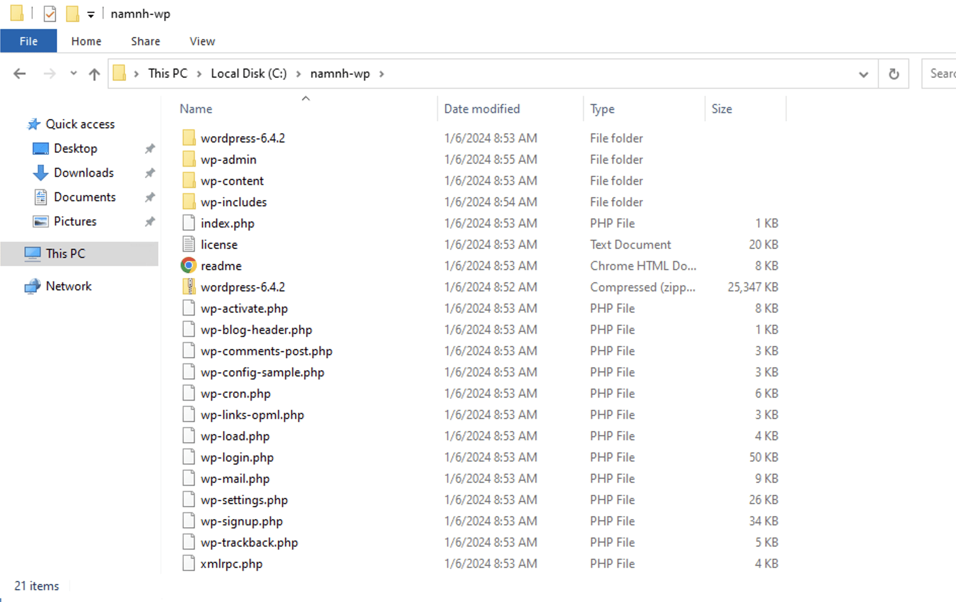 Tiến hành giải nén mã nguồn ngay thư mục namnh-wp. Bạn nhớ thay namnh-wp bằng tên của bạn