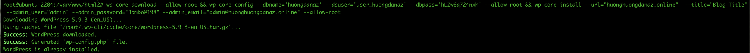 root@ubuntu-2204:/var/www/html# wp core download --allow-root && wp core config --dbname='huongdanaz' --dbuser='user_huongdanaz' --dbpass='hLZw6***4nxh' --allow-root && wp core install --url="huonghuongdanaz.online" --title="Blog Title" --admin_user="admin" --admin_password="EV7H***RbNs" --admin_email="admin@huonghuongdanaz.online" --allow-rootc