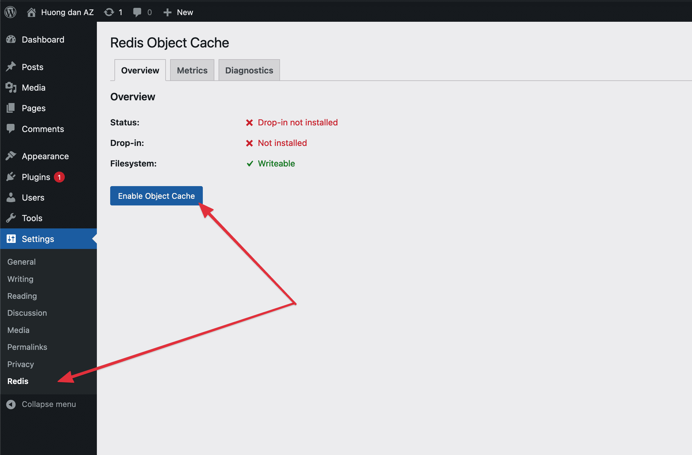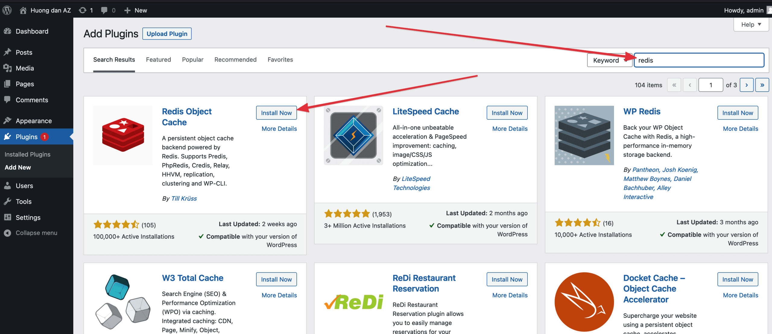Tiếp theo bạn cấu hình redis với wordpress bằng một plugin là Redis Object Cache. Bạn đang nhập vào trang quản trị admin của website sau đó vào phần plugin và tìm, cài đặt plugin này.
