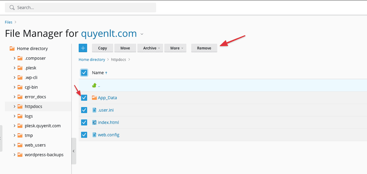 Ở đây bạn cần xoá các file mặc định khi mới thêm website vào thì Plesk sẽ có sẵn :