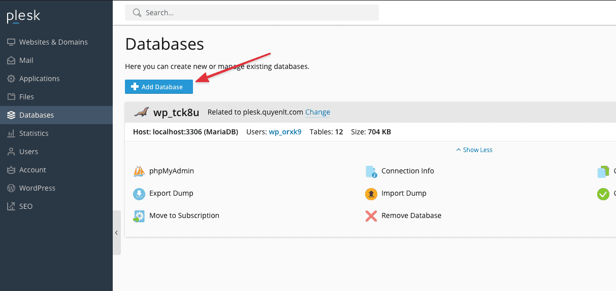 Ở Menu bên trái chọn Database sau đó chọn “Add Database” để tạo database cho website :