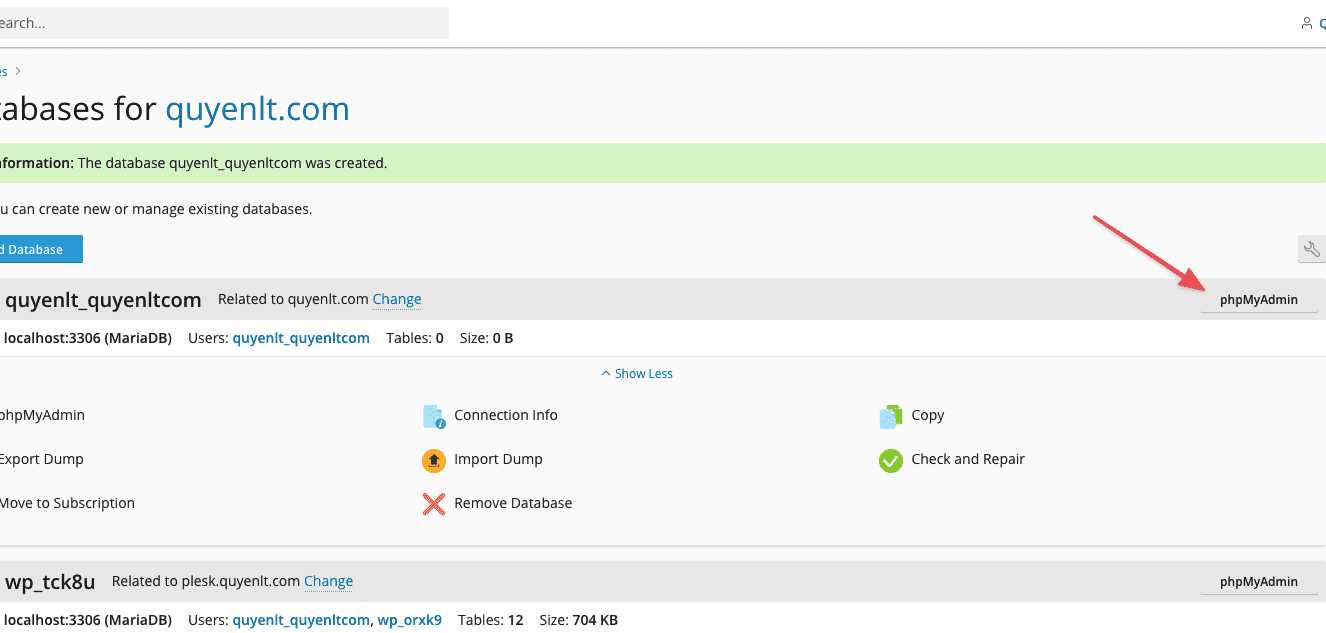 Tại mục Database, tìm tới tên database mới tạo sau đó bấm vào “phpMyadmin” :
