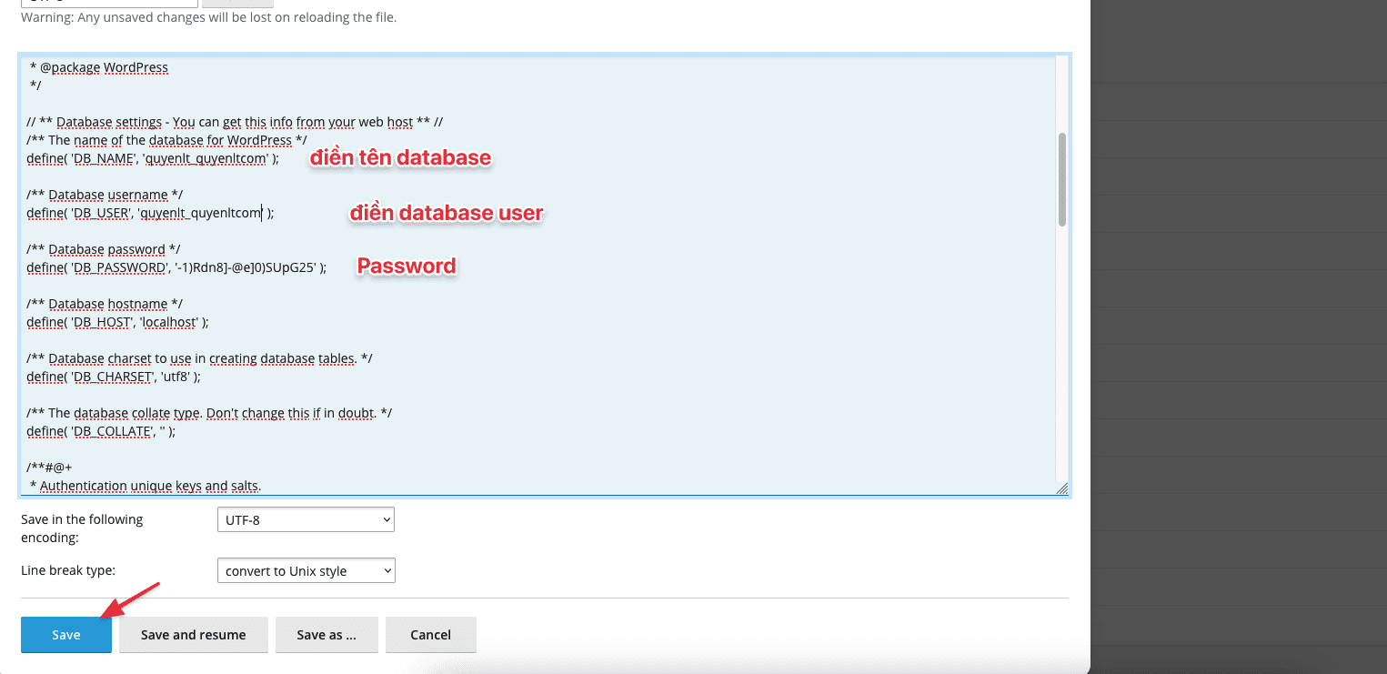 Điền thông tin database đã tạo ở bước 3 vào và lưu lại nhé :