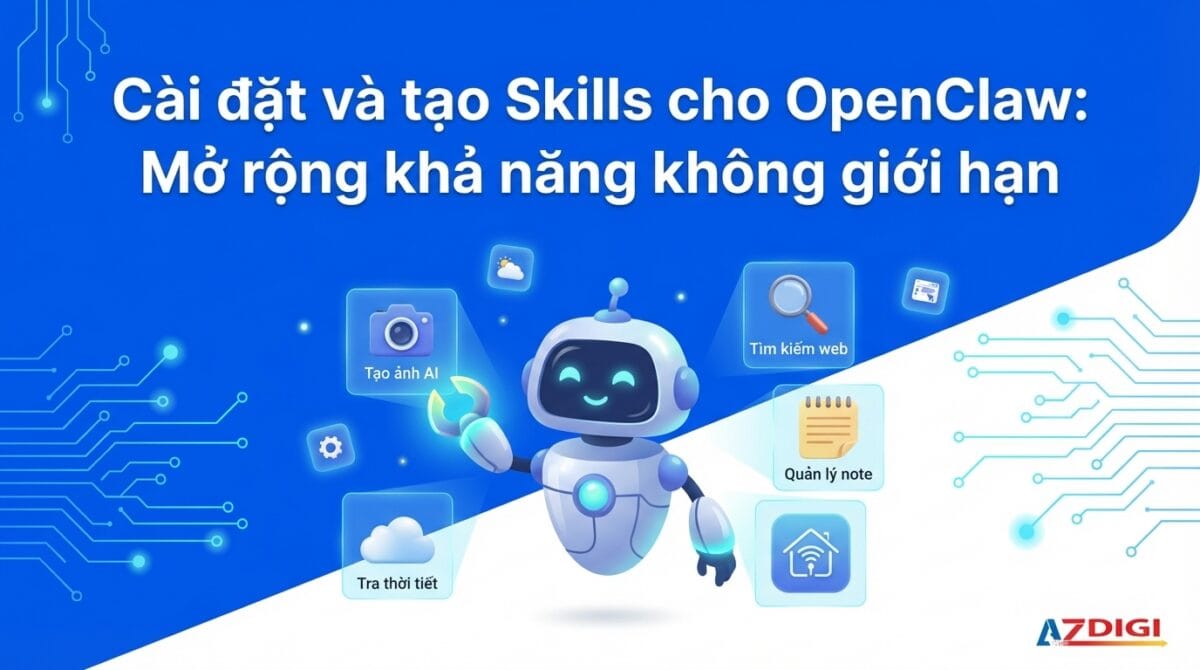 Bài viết này sẽ hướng dẫn bạn cách tìm, cài đặt, cấu hình skills, đồng thời hướng dẫn tạo skill riêng theo nhu cầu của bạn. Đây là bài thứ 5 trong serie hướng dẫn OpenClaw từ A đến Z của AZDIGI.