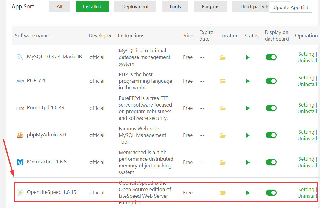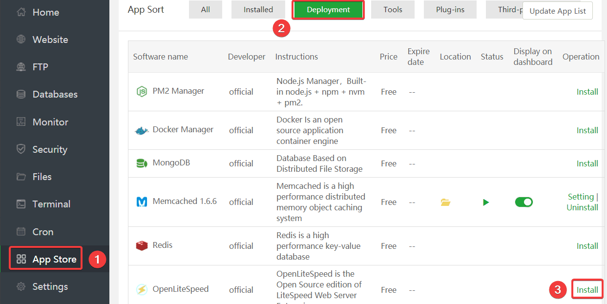 Để cài đặt OpenLiteSpeed,  tại giao diện App Store (1) => Deployment (2) => tại phần OpenLiteSpeed bạn chọn Install (3) để cài đặt.
