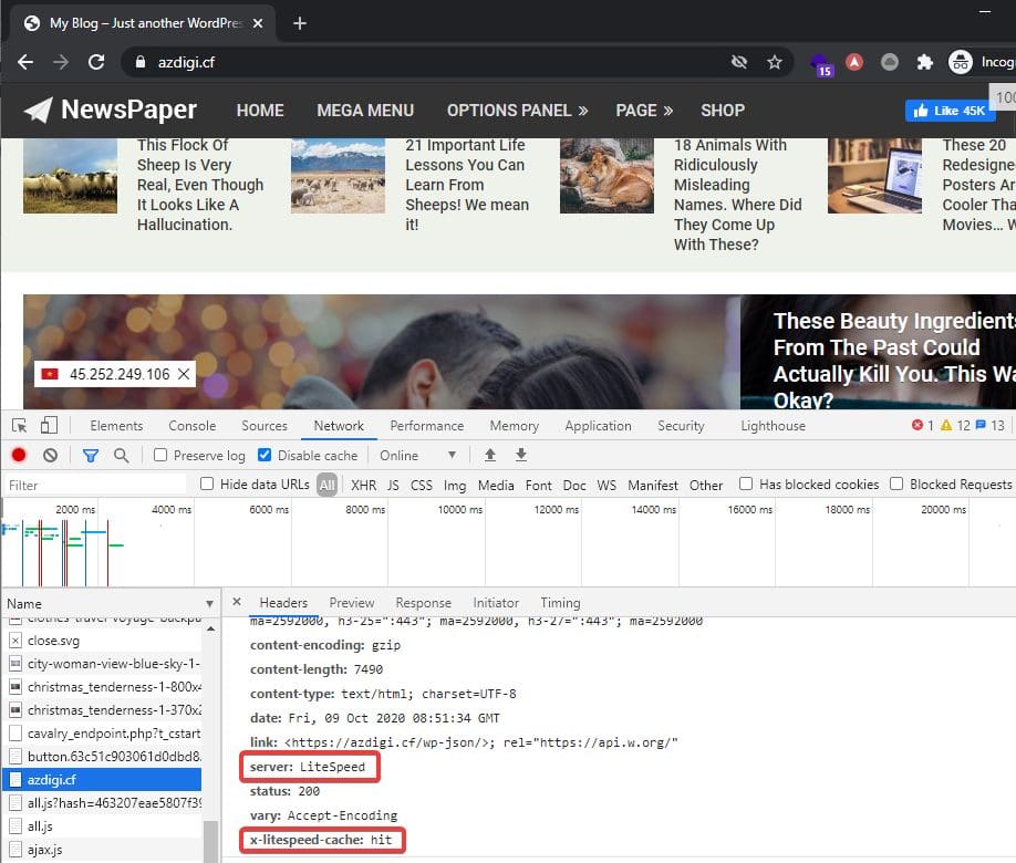 Sau khi cài đặt hoàn tất cài đặt OpenLiteSpeed, bây giờ bạn có thể truy cập và kiểm tra lại website của mình. Như hình dưới là website của mình đã được chạy trên Server Litespeed thành công rồi nhé.