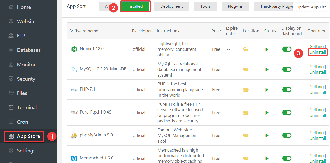 Tại giao diện aaPanel, bạn truy cập App Store (1) => Installed (2) => tại phần Nginx bạn chọn Uninstall (3) để gỡ cài đặt.