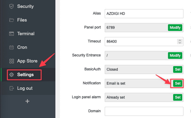 Sau khi đã chuẩn bị xong tài khoản SMTP Mail. Bạn đăng nhập vào AAPANEL và chọn Settings => Notification => Set