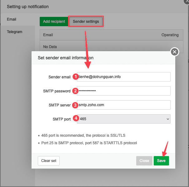 Tiếp đến bạn cần thiết lập tài khoản người nhận mail (Add recipient). Ở tài khoản này chính là tài khoản nhận các thông tin cảnh báo.