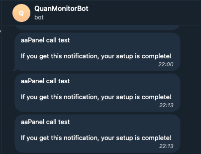 Và bạn sẽ nhận được một thông báo thiết lập hoàn tất từ AAPANEL với Telegram thành công.