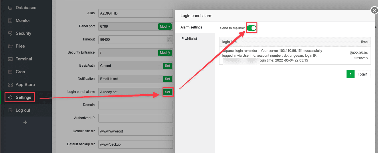 Để thiết lập cảnh báo khi có ai đó đăng nhập vào AAPANEL của bạn. Bạn chọn Settings => Login panel alarm => Alarm settings => Bật Send to mailbox