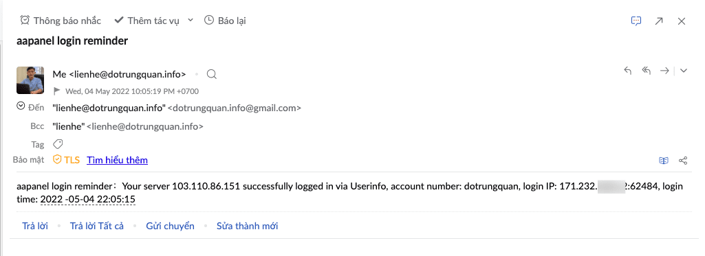 Khi thiết lập xong bạn sẽ nhận được email trả về kết quả vừa thiết lập. Như vậy đã hoàn tất thiết lập cảnh báo với Email trên AAPANEL