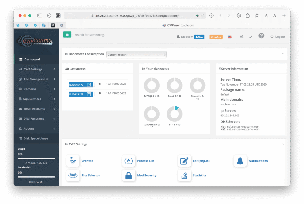 Dưới đây là giao diện CentOS Web Panel của mình.