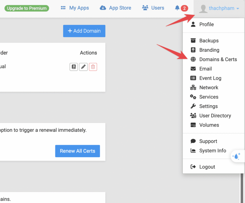 Bạn nhấp vào tên người dùng ở góc phải phía trên, sau đó chọn Domain & Certs.