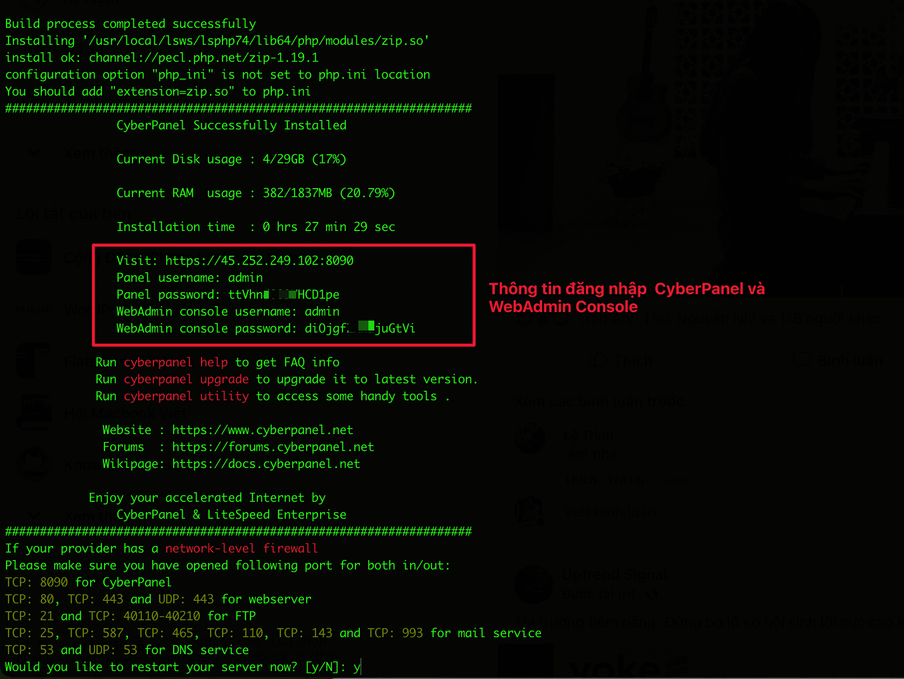- Remote SQL: Chức năng remote SQL từ xa, đây là chức năng mới trên CyberPanel nếu bạn cần cài hãy chọn Y. Nhưng không cần thiết với mình vì mình quản trị DB bằng phpMyAdmin là đủ rồi nên chọn N.