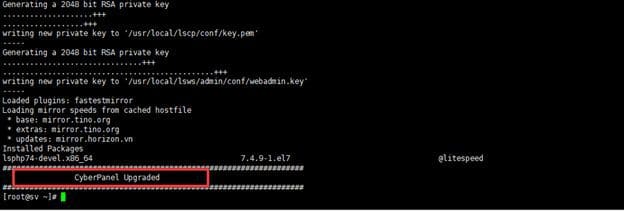 Và khi quá trình Upgrade hoàn tất, các bạn sẽ nhận được thông báo Cyber Panel Upgraded như hình.