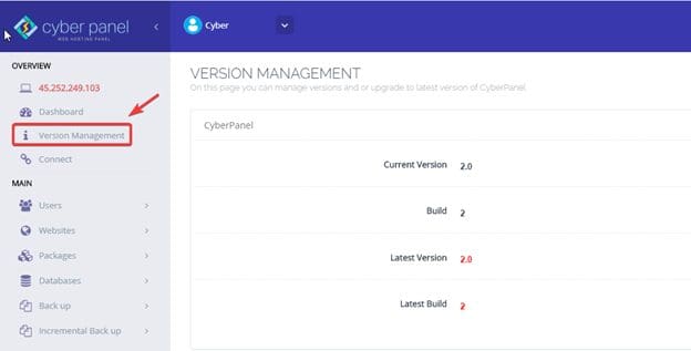 Bây giờ các bạn vào trang quản trị Cyber Panel => Version Management để xem phiên bản mới nhé.