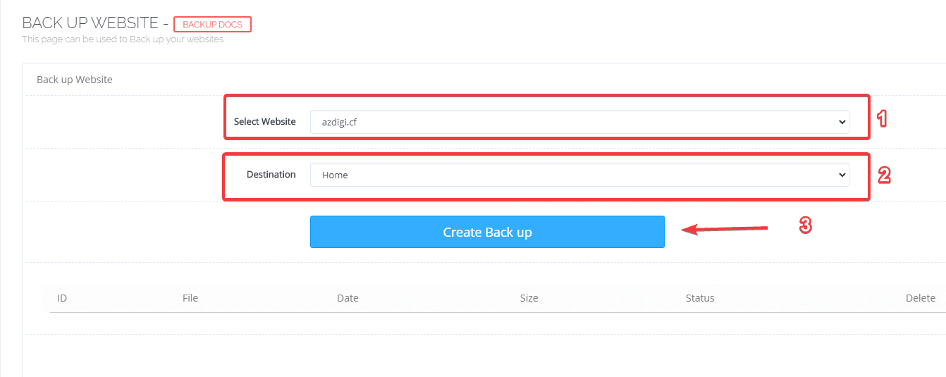 Đường dẫn chứa file backup sẽ lưu tại: Websites (1) => List Website (2) => Chọn website vừa backup (3) => Backup.