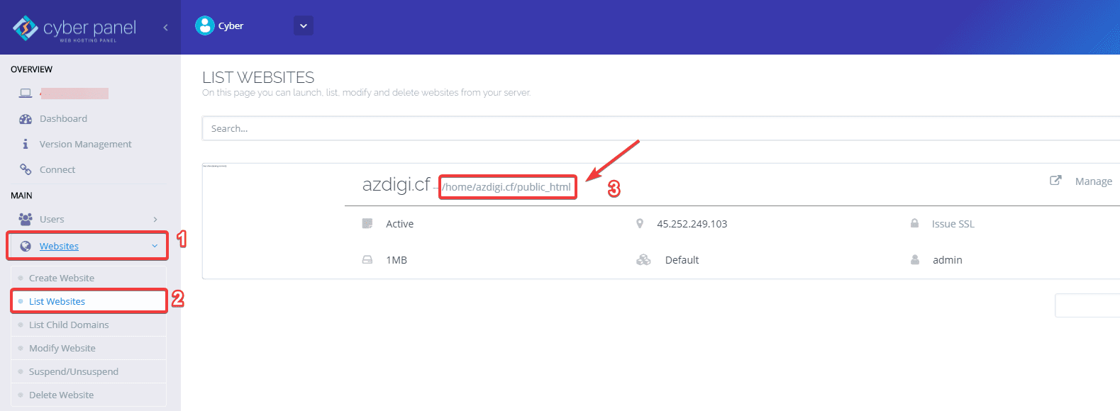 Để xóa website bạn truy cập vào Cyber Panel , chọn Websites (1) => Delete Website (2) => Chọn website cần xóa (3) => Delete Website (4).