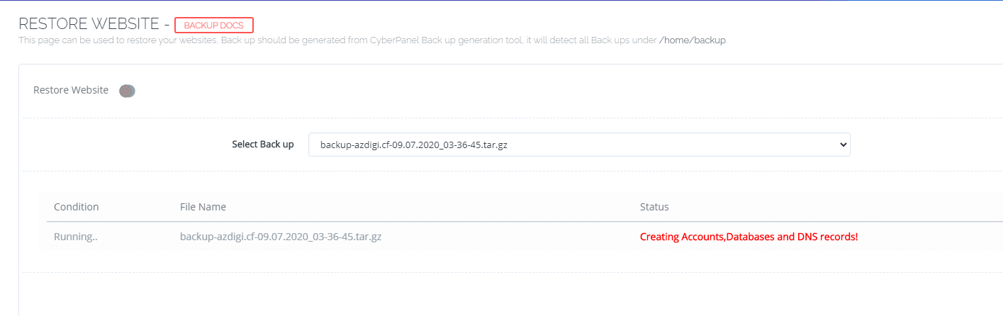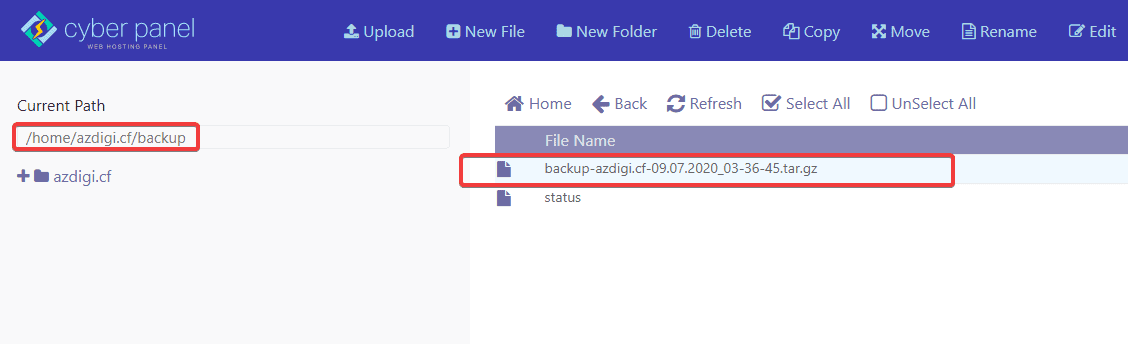 Trước khi thực hiện Restore thì các bạn cần thực hiện thêm một bước là di chuyển file backup đến đúng đường dẫn /home/backup mà Cyber Panel yêu cầu, vì mặc định khi tạo backup thì file sẽ được lưu tại /home/azdigi.cf/backup. Vì nếu không làm thêm bước này thì thì các bạn sẽ không tìm thấy file backup để thực hiện Restore và sẽ nhận cảnh báo như hình.