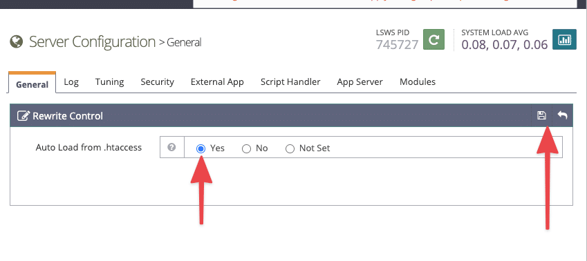 Bước 2: Truy cập vào Server Configuration và bật Load .htaccess