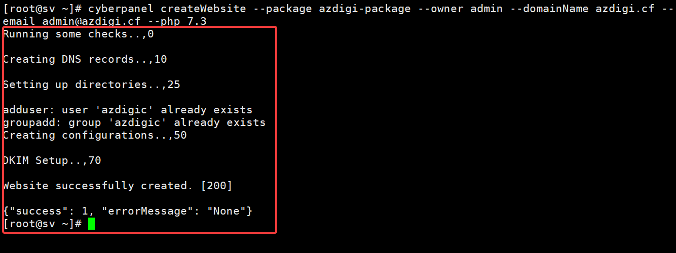 cyberpanel createWebsite --package azdigi-package --owner admin --domainName azdigi.cf --email admin@azdigi.cf --php 7.3