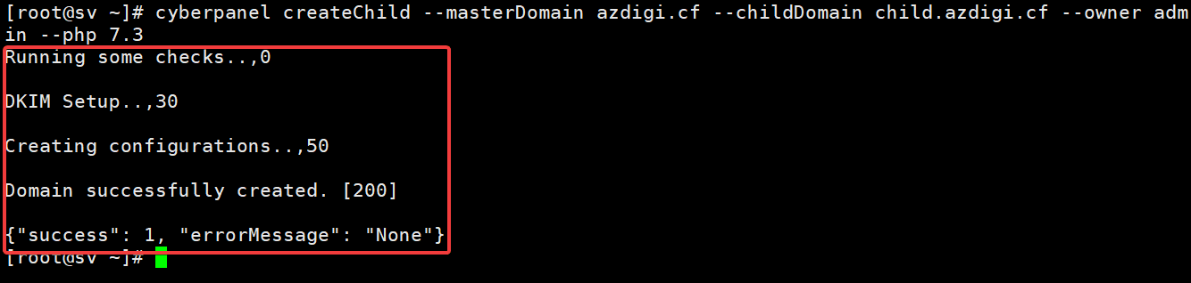 cyberpanel createChild --masterDomain azdigi.cf --childDomain child.azdigi.cf --owner admin --php 7.3