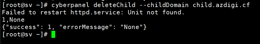 cyberpanel deleteChild --childDomain child.azdigi.cf