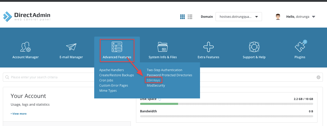 Sau khi đã có SSH Key bạn truy cập vào DirectAdmin => Advanced Features => SSH Keys