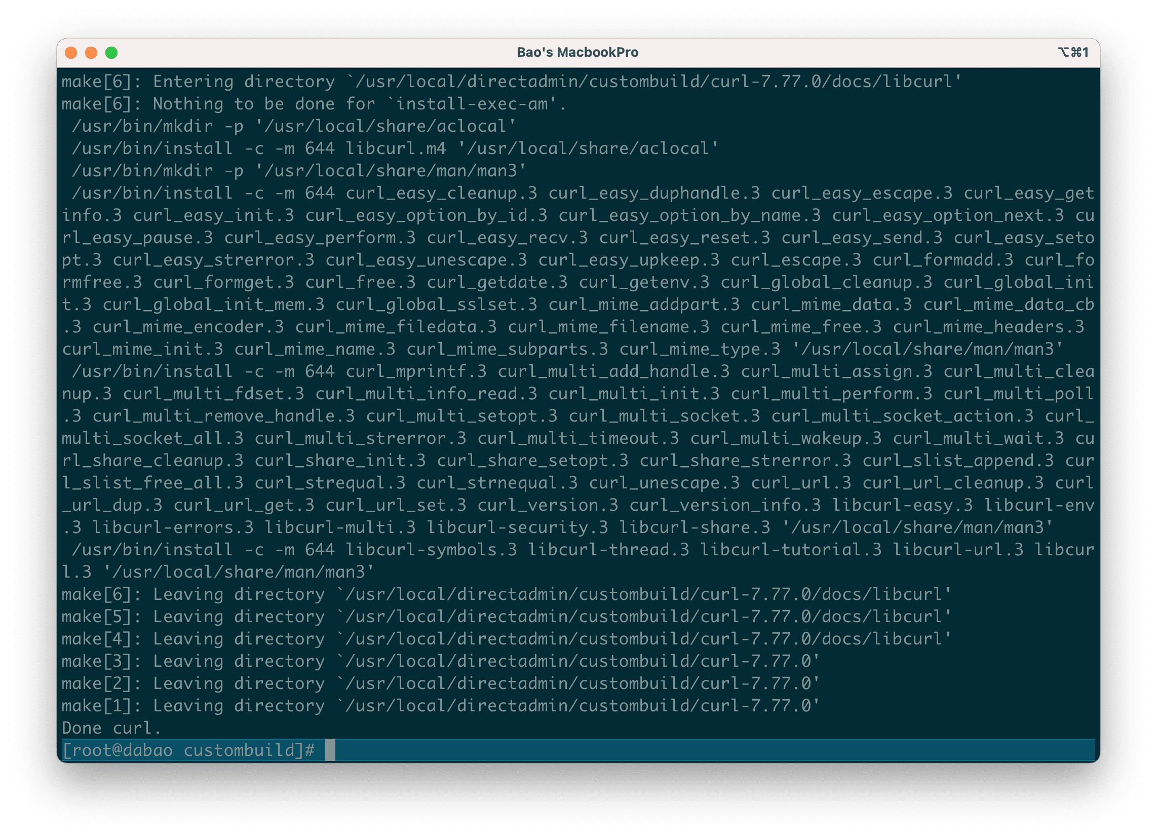 Lệnh 3: Cập nhật custombuild script, các bạn cũng có thể thấy khi chúng ta cập nhật thì custombuild cũng tải về bản cài đặt mới nhất của cURL hiện tại.