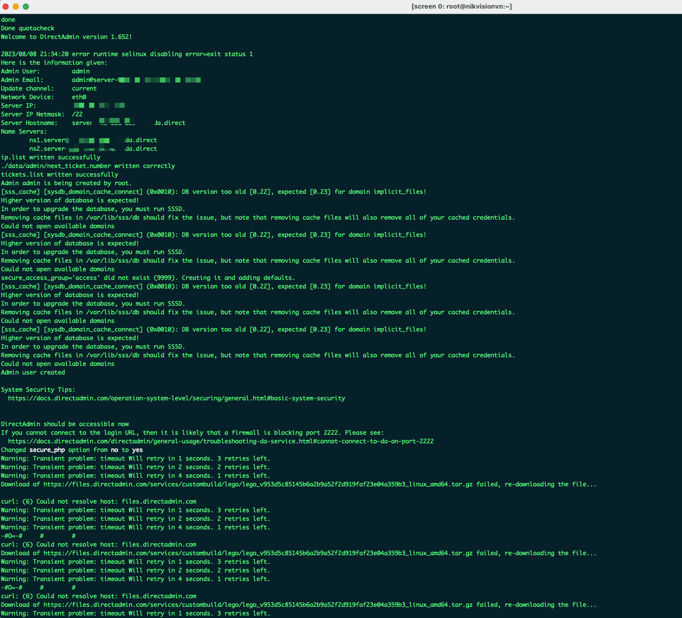 Lỗi này cho biết rằng không thể phân giải được DNS với đến máy chủ DirectAdmin để cài đặt, mặc dù trước đó máy chủ server đã định cấu hình DNS trong /etc/resolv.conf.