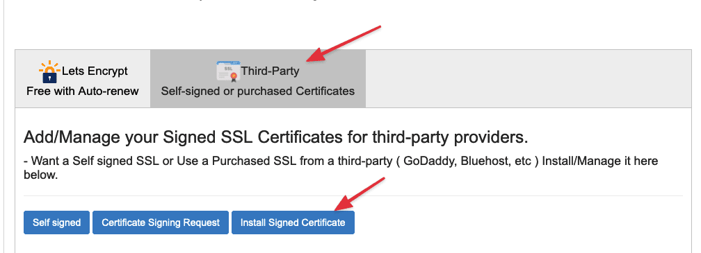 Trong giao diện Sencrypt SSL bạn chọn vào Third-Party sau đó Click vào Install Signed Certificate để bắt đầu nhập vào chứng chỉ SSL của bạn:
