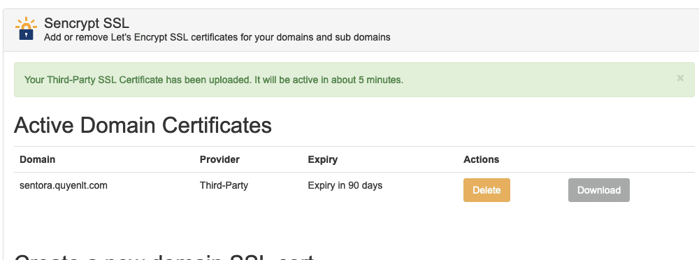 Đợi vài giây để Sentora cấu hình các chứng chỉ lên website của bạn :