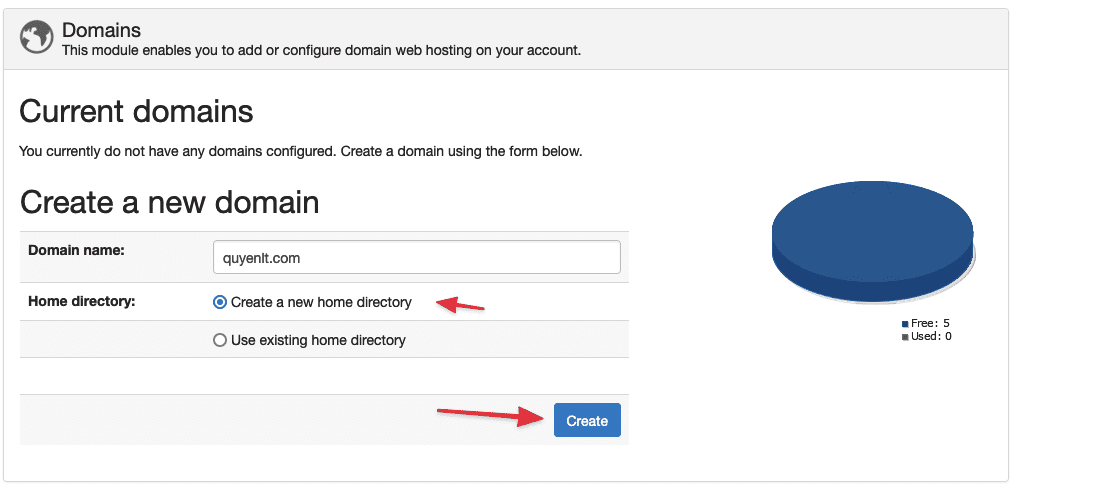 Ở giao diện Domains các bạn nhập Domain cần thêm và tích vào ô Create a new home directory để tạo một Document Root mới cho website :