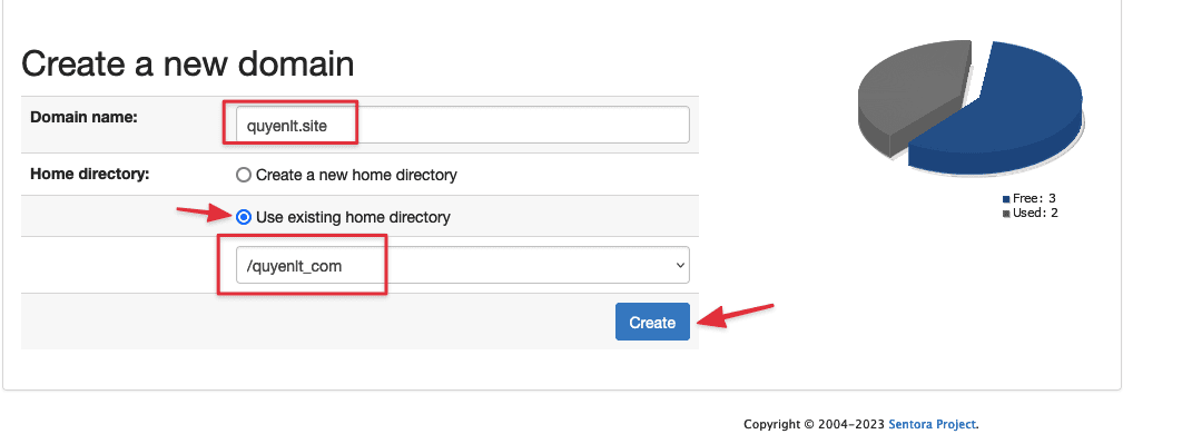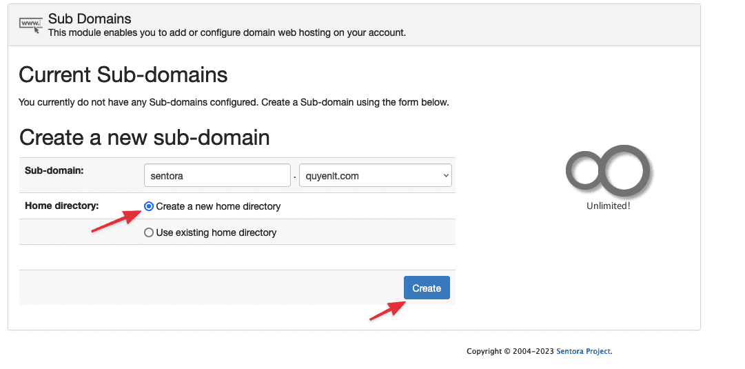 Sau khi điền đầy đủ thông tin bạn Click vào Create chỉ mất vài giây để Sentora thêm Sub Domains hoàn tất.