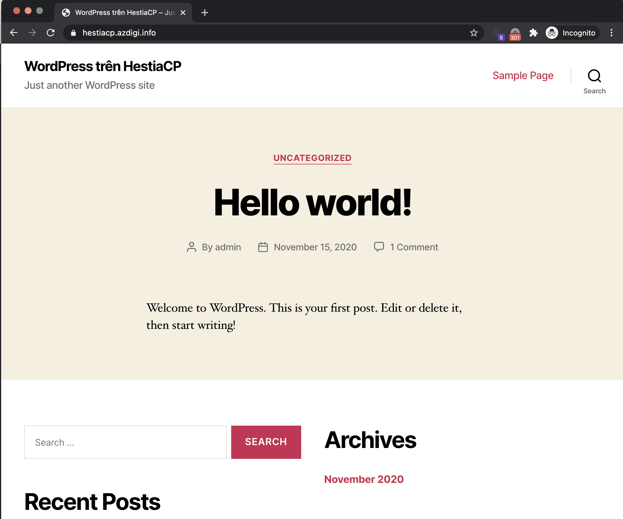 Và đây là thành quả của mình. Một website WordPress mặc định được thiết lập. Bây giờ bạn có thể thiết kế website cho riêng mình rồi.