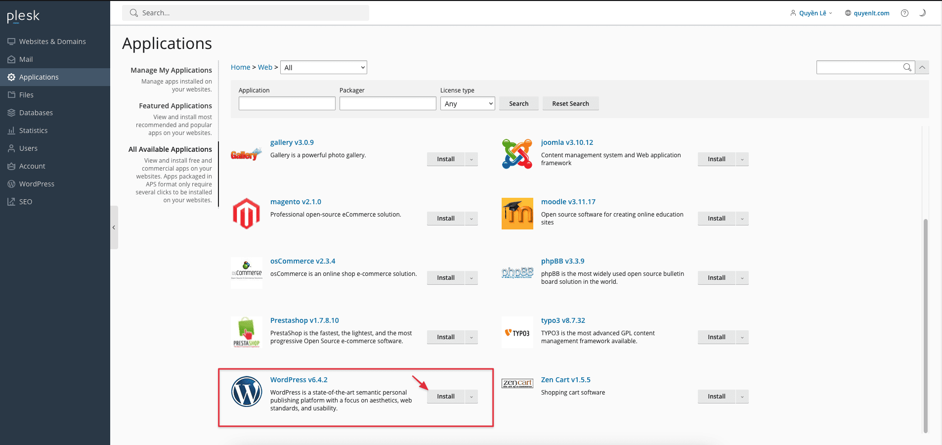 Ở đây bạn sẽ thấy tất cả các mã nguồn và app có trên hosting, để cài WordPress bạn bấm vào “All Available Applications” nhé