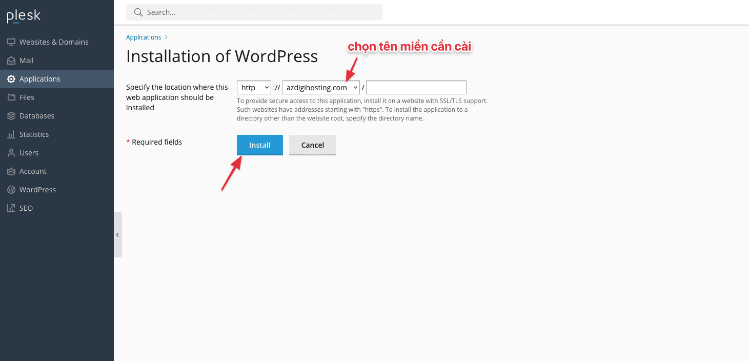 Tới đây bạn nhập tên miền cần cài và click vào “Install” sau đó đợi ít phút cho tới khi quá trình cài hoàn tất nhé