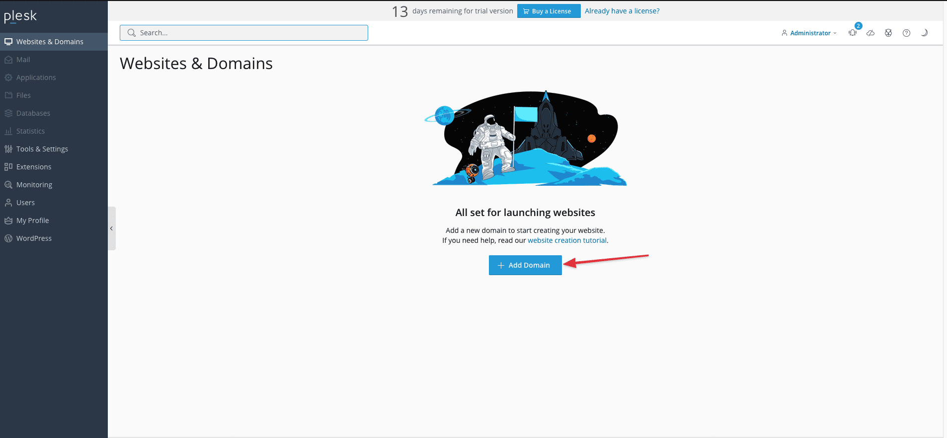 Tại “Websites & Domains” bạn chọn “Add Domain” để thêm tên miền vào nhé.