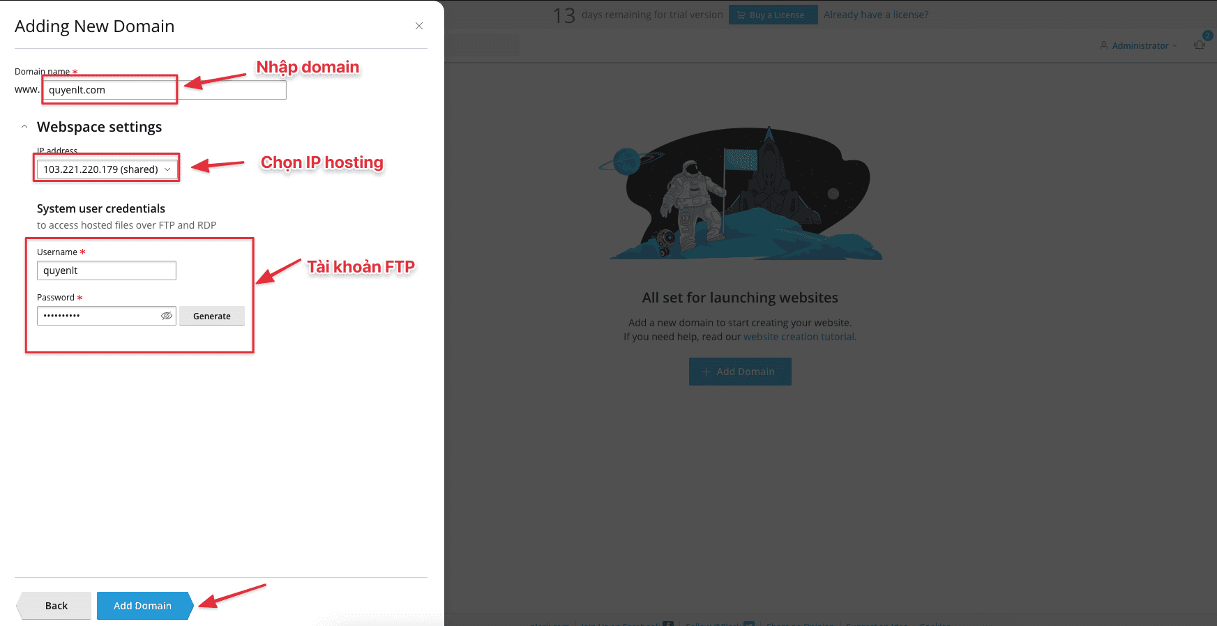 Tiếp theo nhập tên miền và lưu lại tài khoản FTP sau đó Click vào “Add Domain” và đợi quá trình khởi tạo hoàn tất nhé.