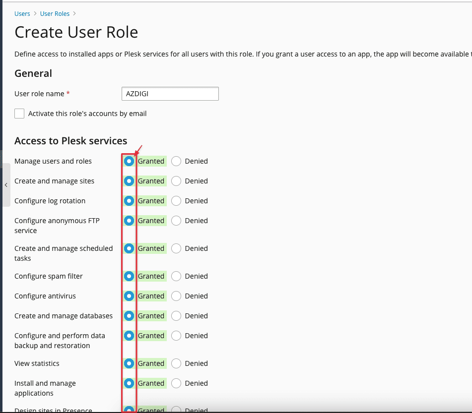 Tiếp theo nhập tên User Roles mà bạn muốn , sau đó phân quyền cho Roles vừa tạo , ở đây mình cho phép tất cả sau đó bấm “OK” để tạo.