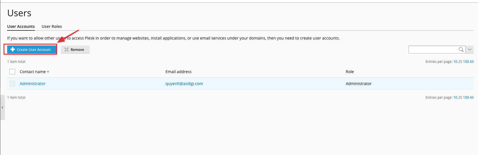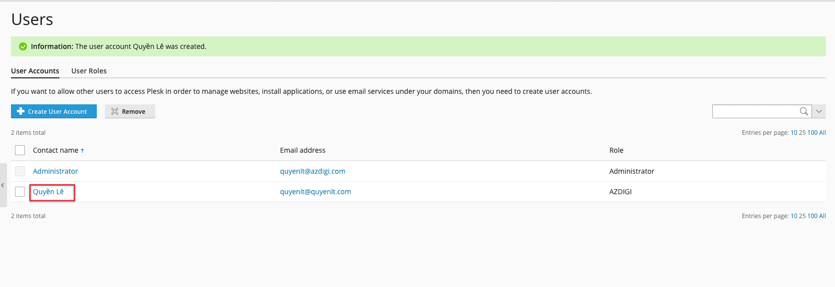 Sau khi tạo xong bạn sẽ thấy được User , Mail, và Role của tài khoản này.