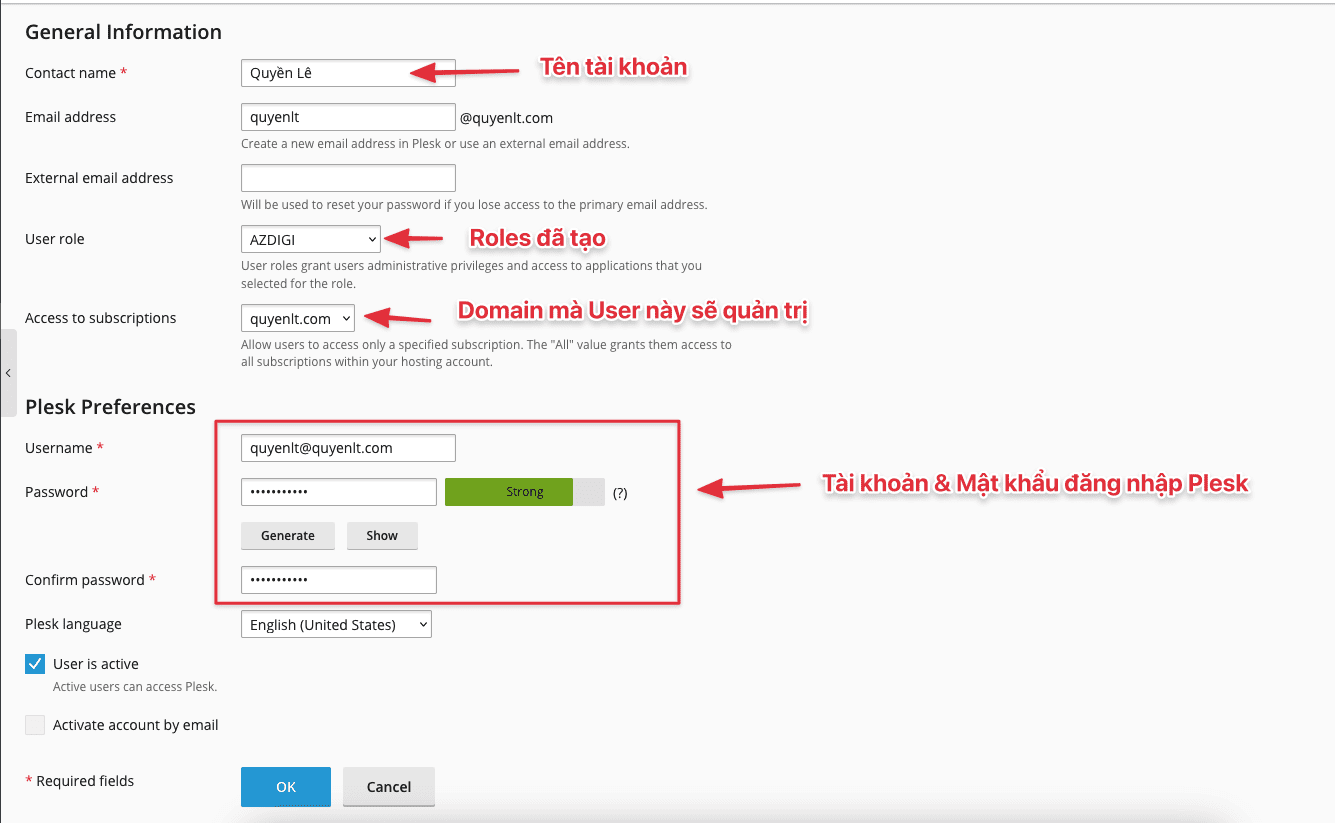 Các bạn điền thông tài khoản ,chọn User Role mới tạo, quan trọng là cần chọn Domain mà User này sẽ quản lý sau đó Click vào nút “OK” .